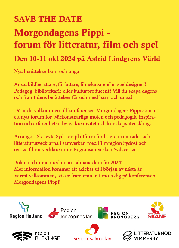 Men var finns de berättelser som kan göra något liknande idag? Hur skapas de och hur förmedlas de? Idag rör sig berättandet i en mångfald av medier, från spel och poddar till filmer och böcker. I ett samarbete med litteraturutvecklare och filmutvecklare inom Regionsamverkan Sydsverige bjuder Litteraturnod Vimmerby därför in kreatörer med fokus på berättelser för barn och unga inom olika medier till två dagars forum på Astrid Lindgrens Värld, den 10-11 oktober 2024. Inspiration, nätverkande och ny kunskap för såväl pedagoger, bibliotekarier och kulturarbetare. Kanske som en fortbildningsinsats? Stäm av med din arbetsgivare och boka in i kalendern.