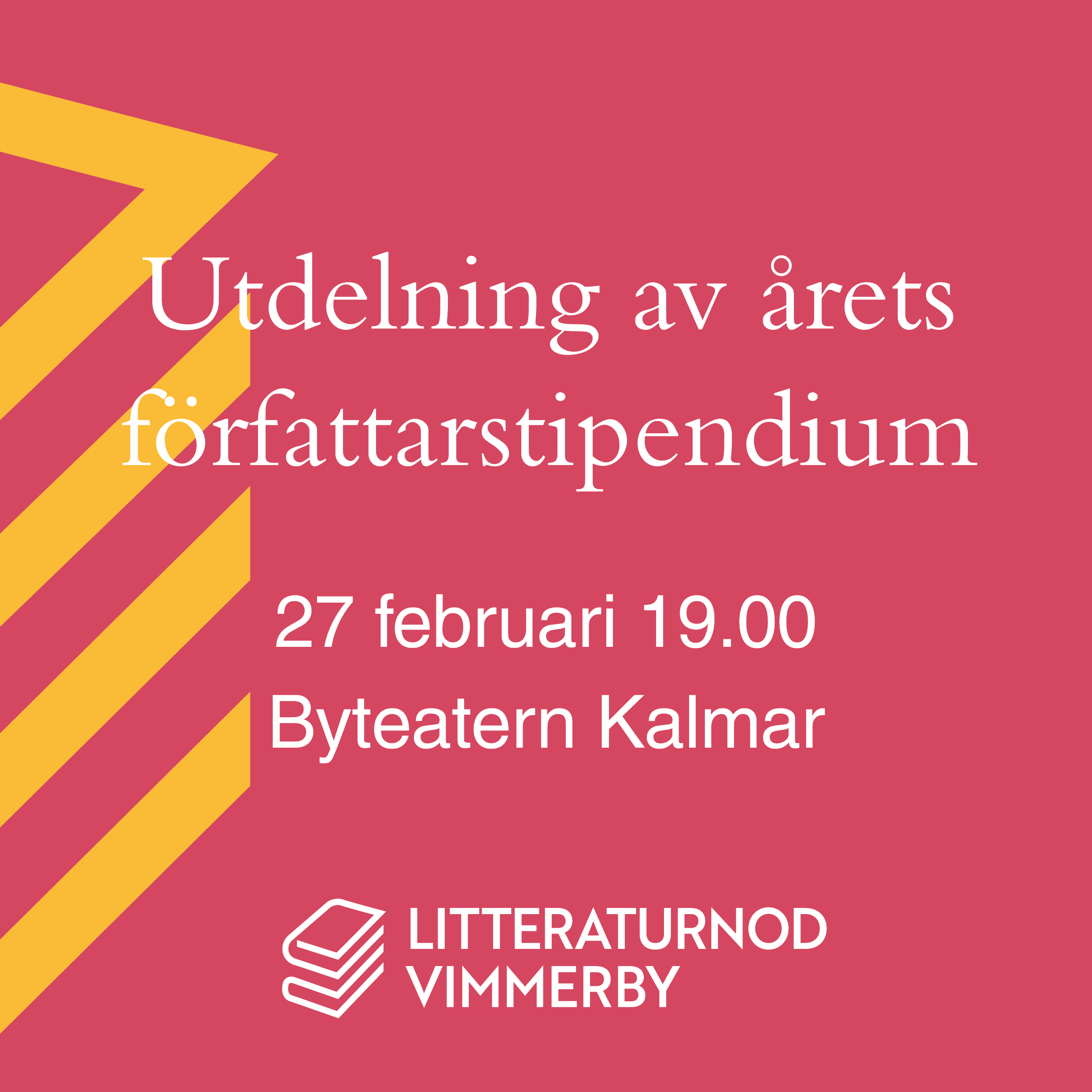 Den 27 februari är det dags! För tredje gången delas Litteraturnod Vimmerbys författarstipendium ut. Vem som blir årets mottagare avslöjas i samband med utdelningen på Byteatern Kalmar Länsteater.